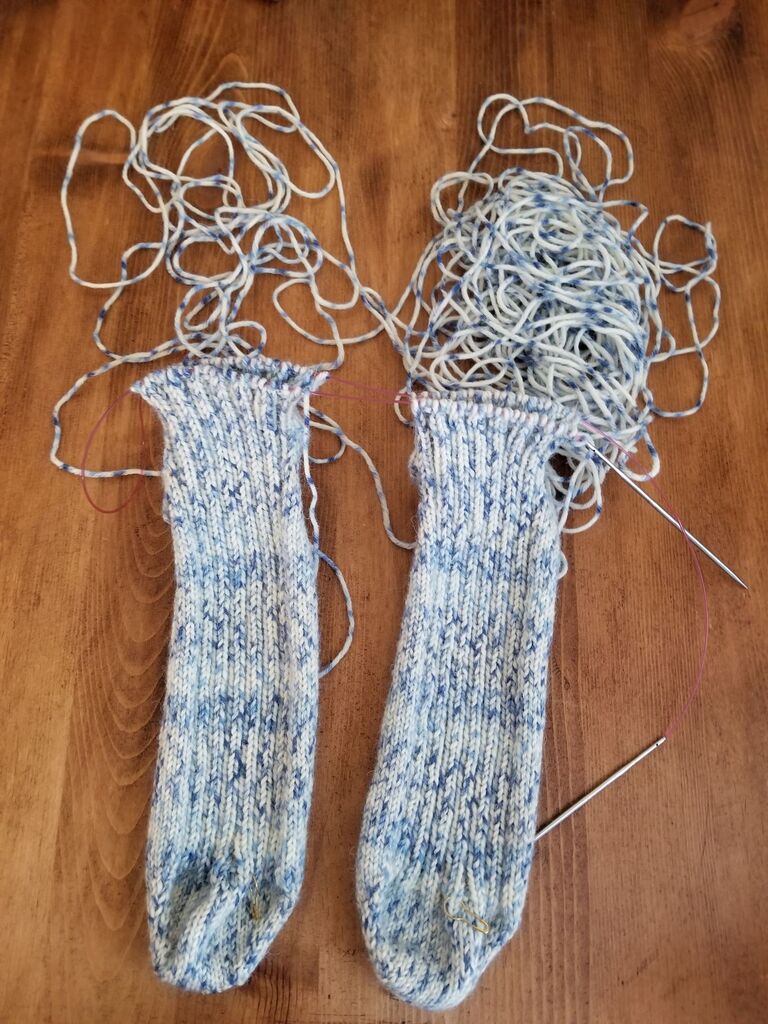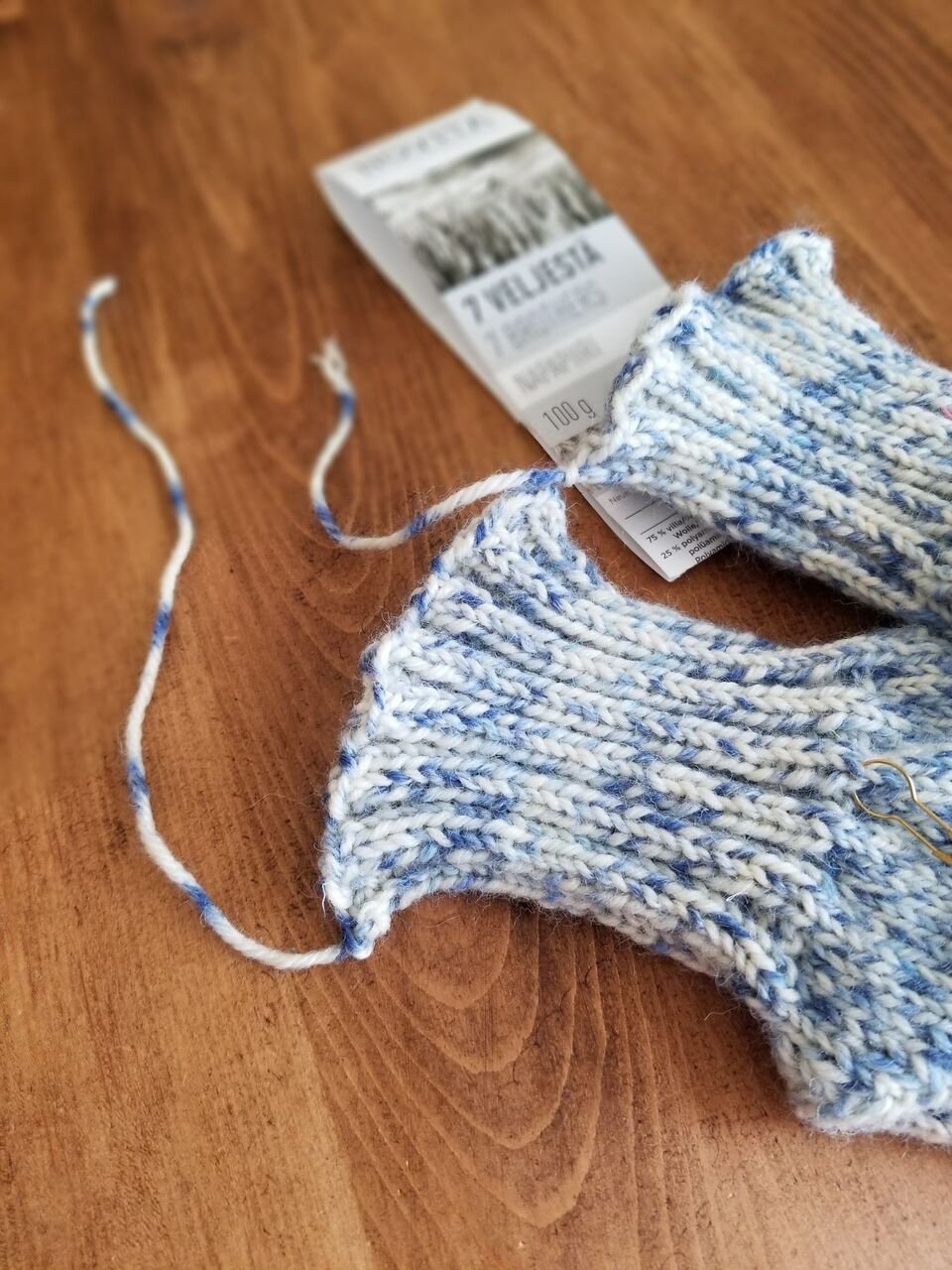 片足編んでるときに想像より糸減りが早く考えて編まないと足りなくなる予感がしました。この一玉しかないので何とかして糸を切らず一足編もうと考えた結果・・・。