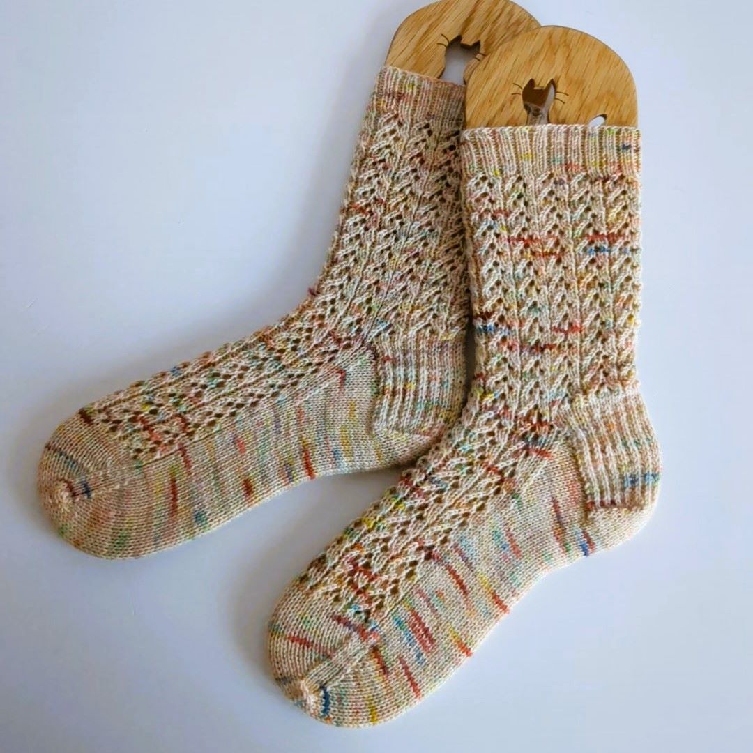 June 15, 2024 ヤツがきた時に編んでたもの ヤツがやってきて回復するまでに時間がかかっていましたが、その時手軽で編みやすかったのは靴下でした。その時に編みあがった一足毛糸は知人が染めていただいたものMercury SocksBy Kim McKenzieにほんブログ村ライフスタイルランキング タグ :#手編み靴下#棒針編み#ハンドメイド#靴下