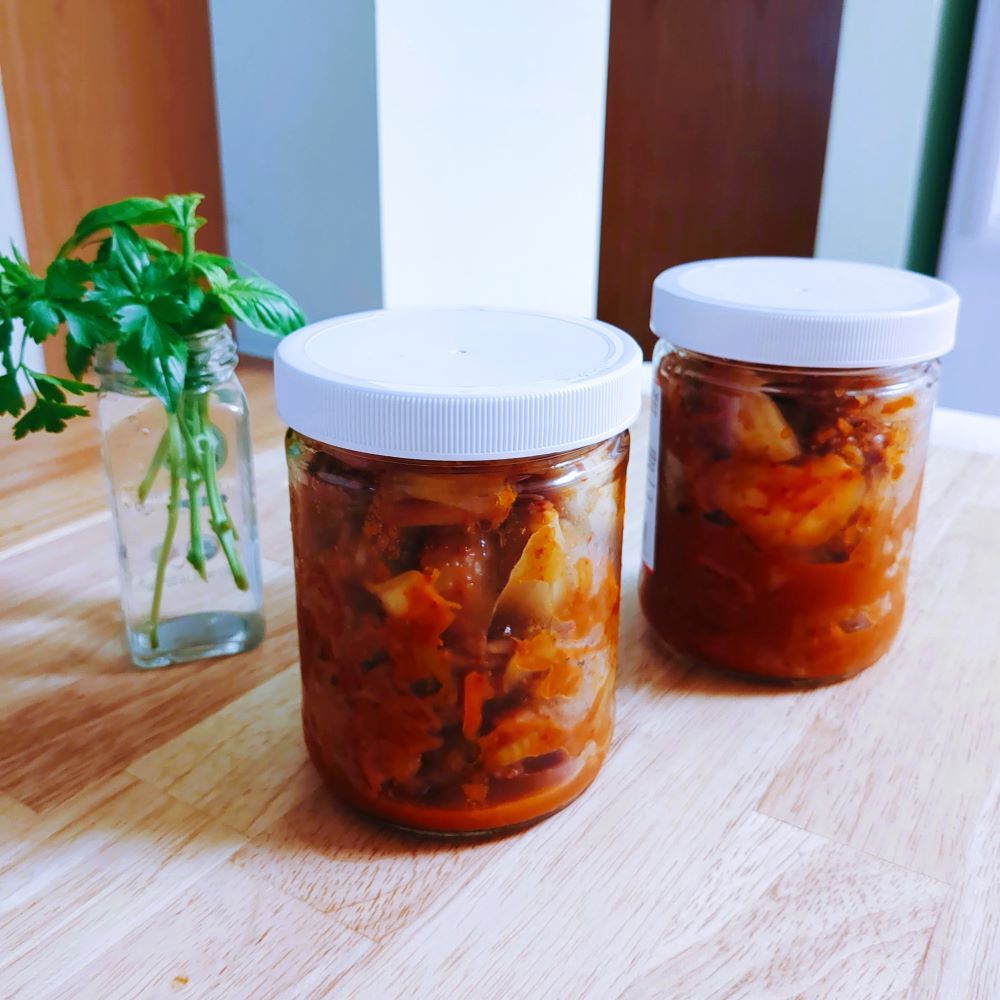 など、手に入りにくい材料は代用品を使いましたが、ちゃんとキムチに仕上がりました。少し甘かったけれど、満足です。多分少し癖のあるCostcoのハチミツのせいかな?